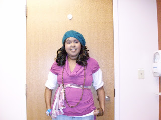 Today was a colorful outfit day! I had on my usual layers, but it wasn't nearly as cold today. We were actually in the 30's today.I had on a white tank, a mid length white shirt and then I have this mini dress with the cowl neck line in this purply pink magenta color that I have all through out my closet. Unfortunately, I don't have any beanies in brown or the purply pink magenta color. I have hair flowers, but that didn't seem appropriate with all the snow on the trees outside and I donned the teal beanie which was a nice accent. I wore brown accessories and added a colorful little scarf around my waist to accent the colors. I also have a bag that matches the colors exactly, but I didn't get a pic of that. Make up was light and pink to accent the